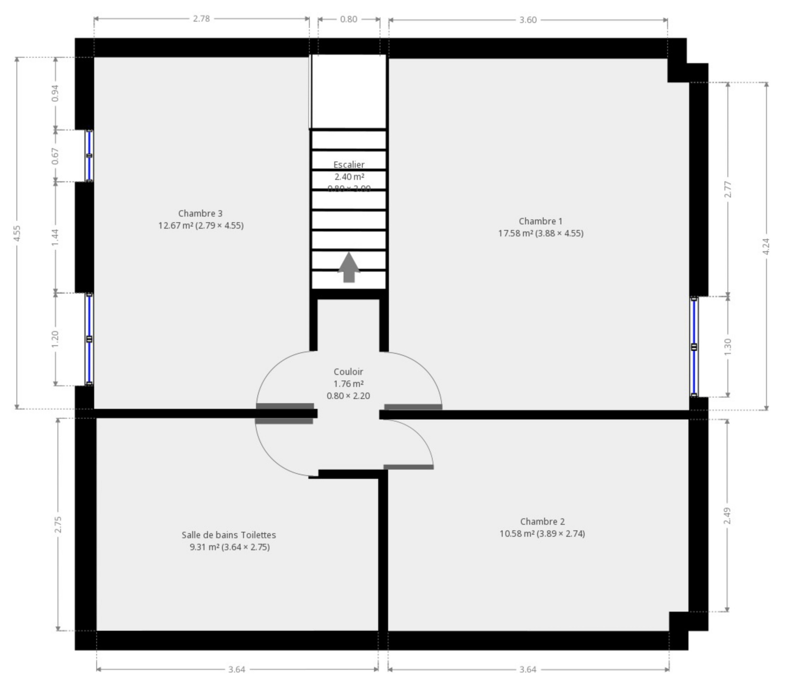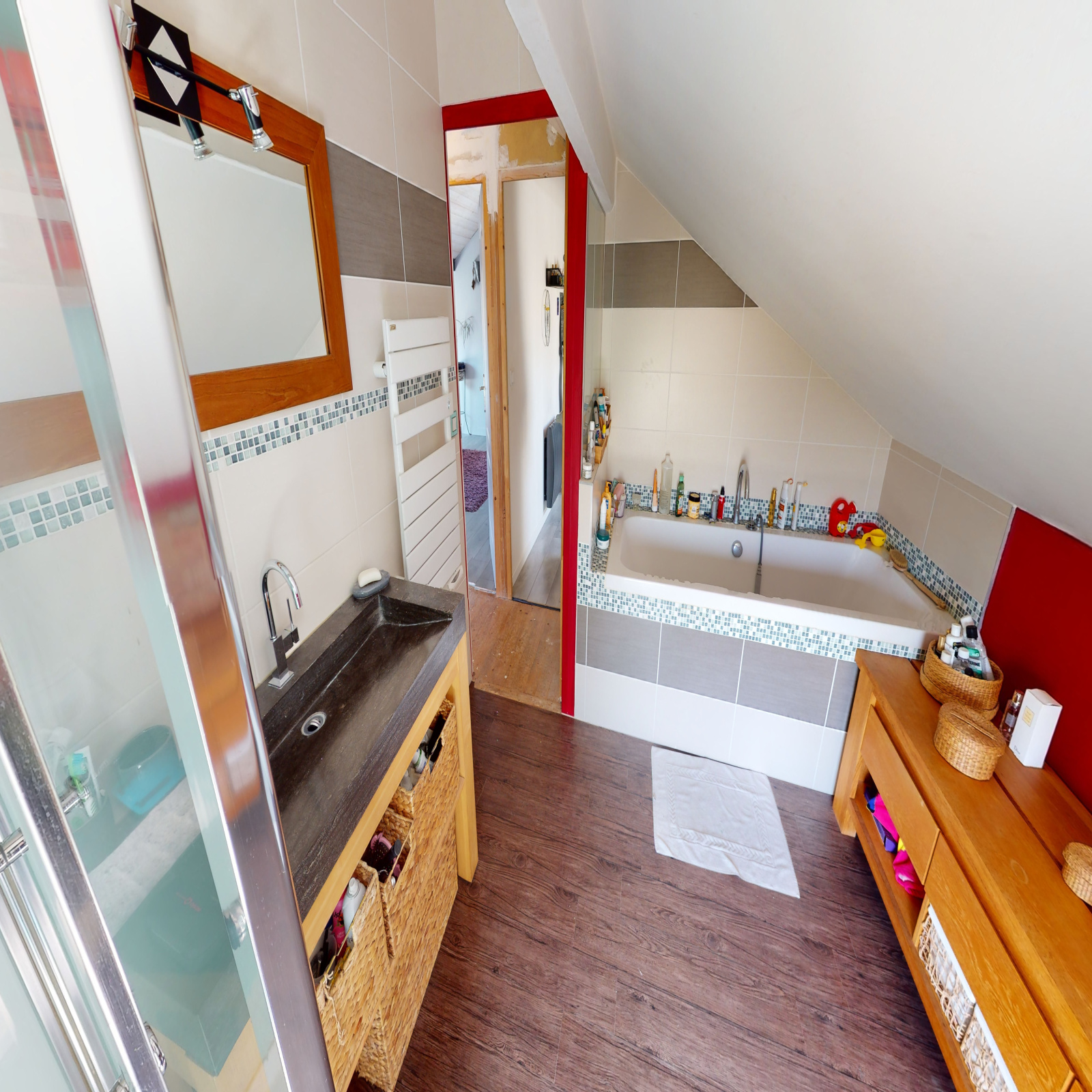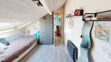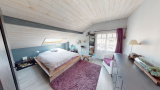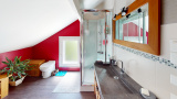 Etage sous-pente : 3 chambres, salle de bains + douche avec wc.