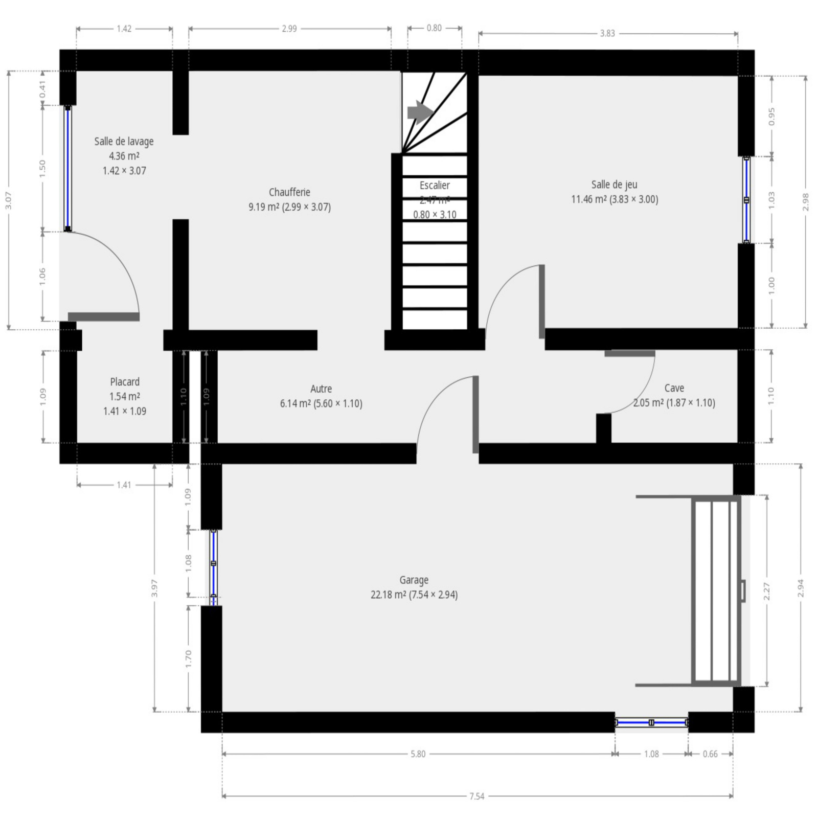 Rez-de-jardin : garage double, salle de jeux, cellier, buanderie.
