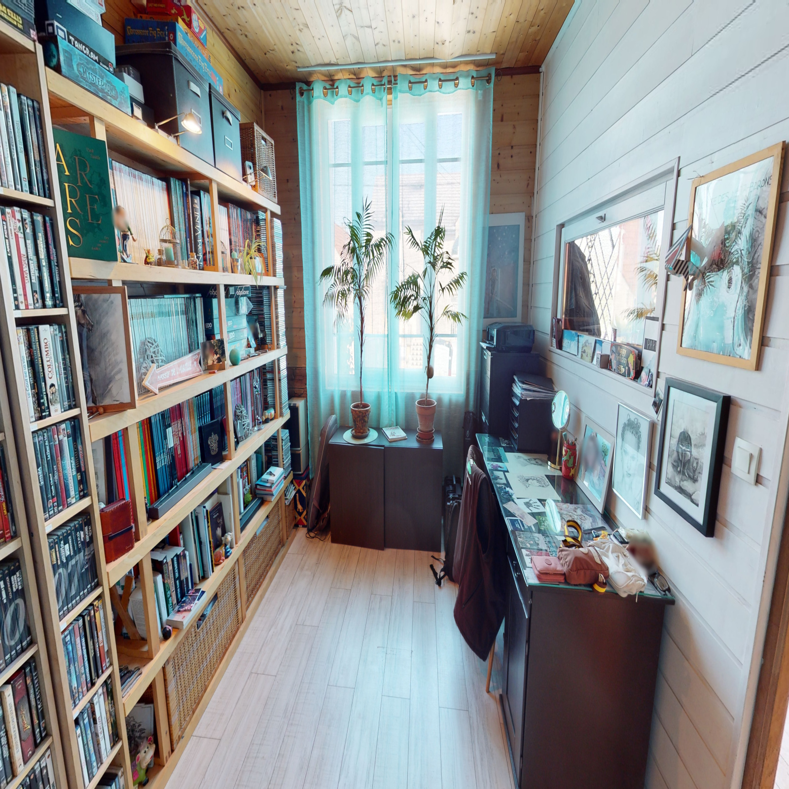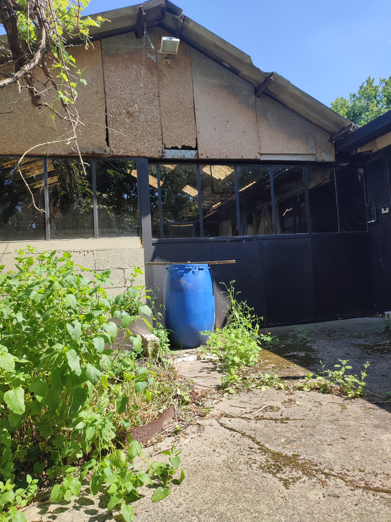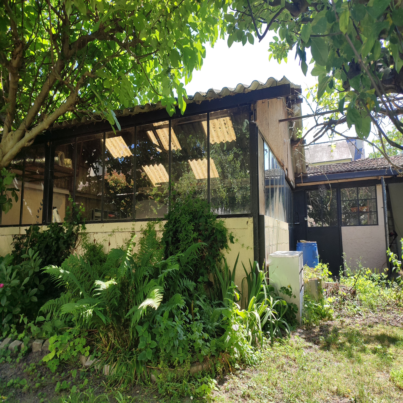 Atelier vitré de 72 m² en fond de parcelle avec passage de 4 m de large sur le côté de la maison.