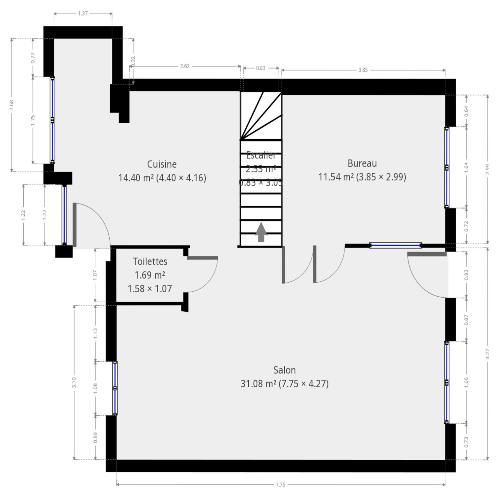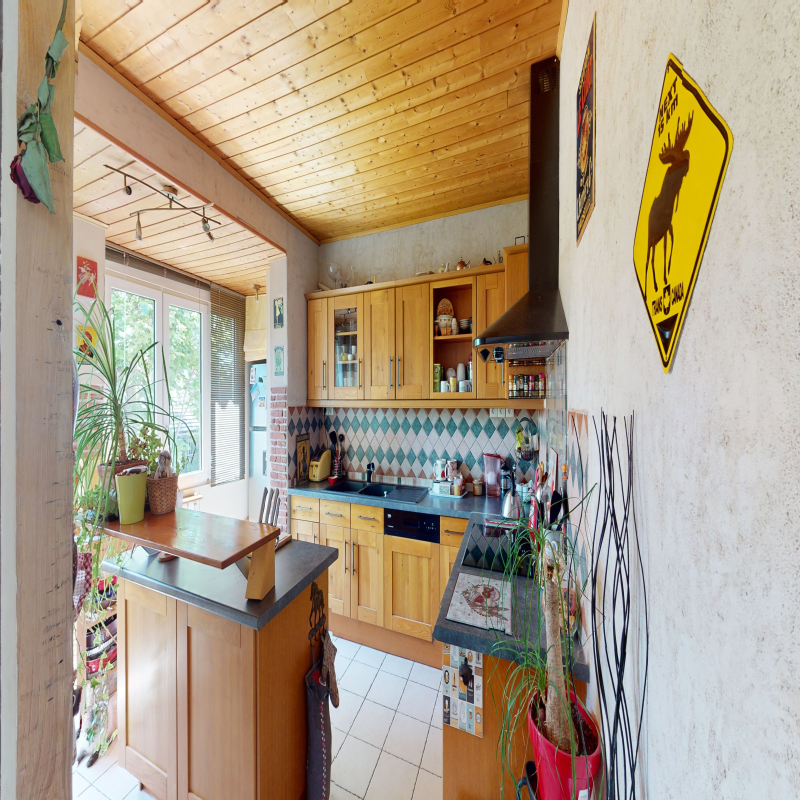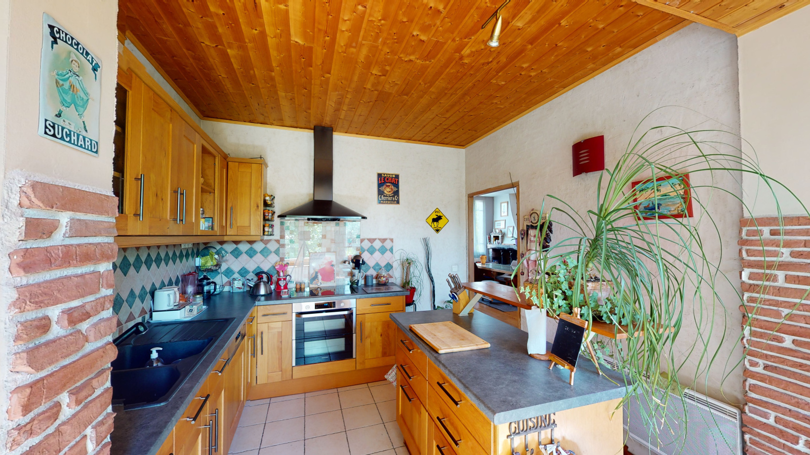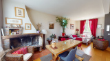Rdc surélevé : Séjour de 31 m² avec cheminée, grande cuisine équipée donnant sur une terrasse sur l'arrière du jardin, wc, bureau avec escalier donnant à l'étage.