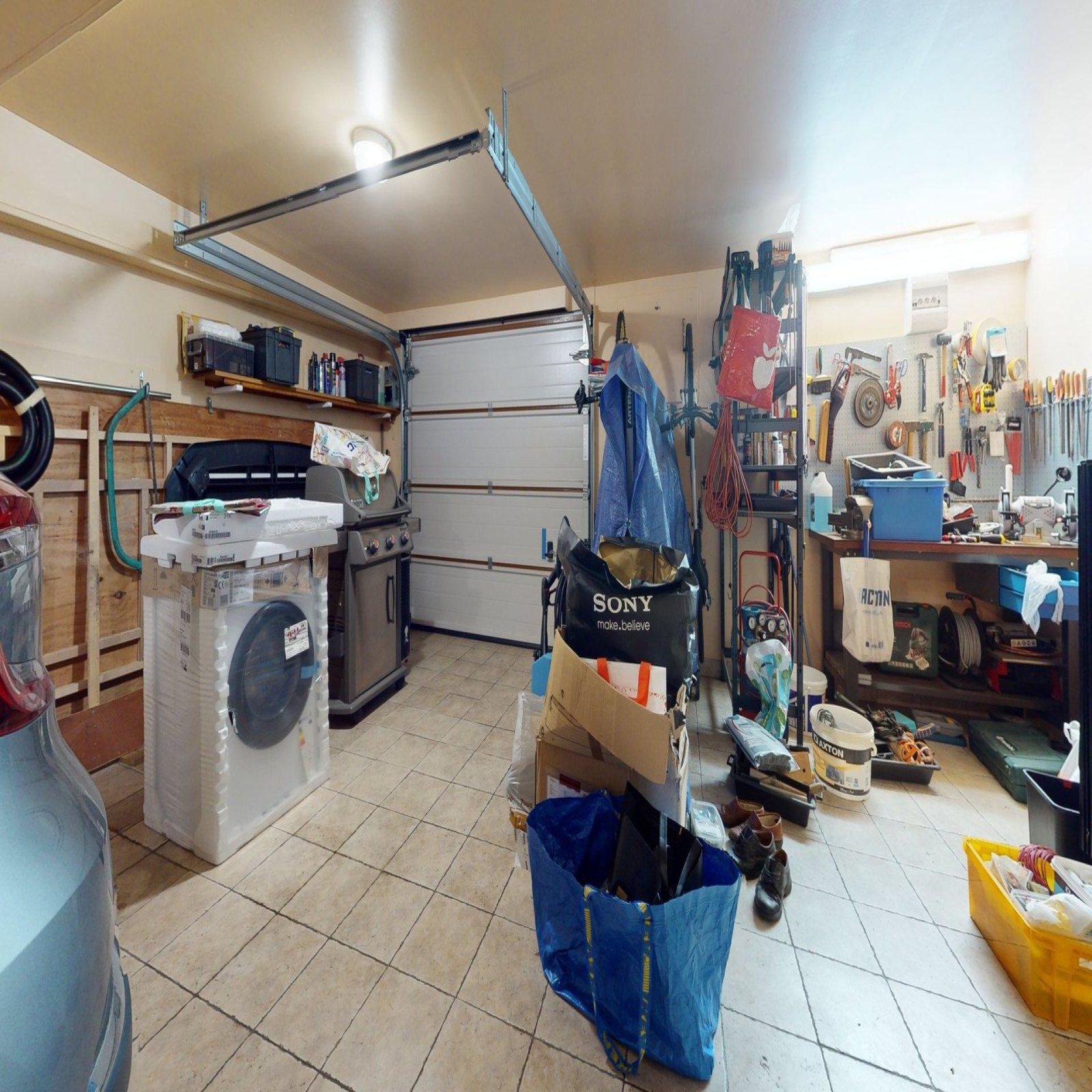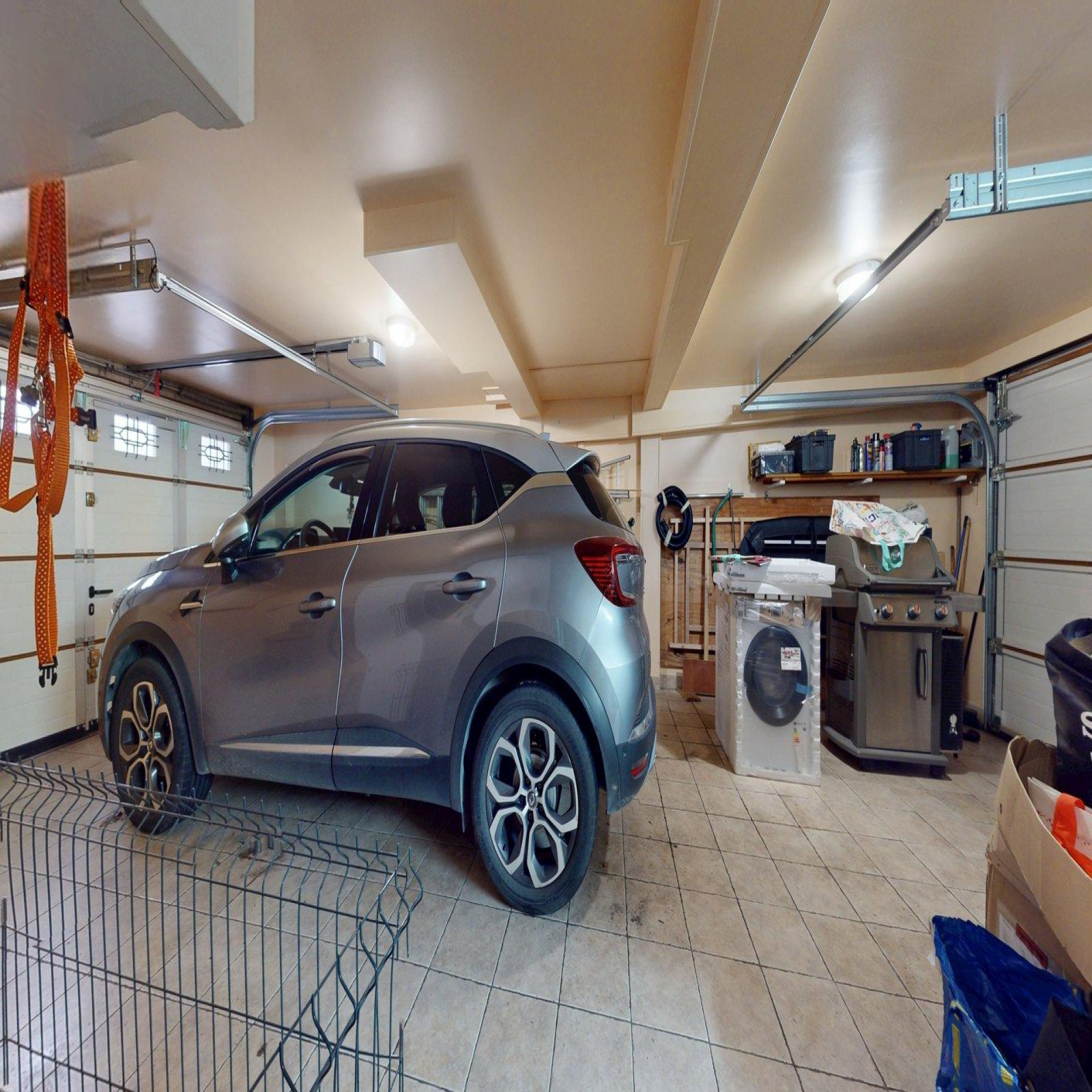 Rez-de-jardin : Garage double avec portail électrique, buanderie, pièce, accès jardin.