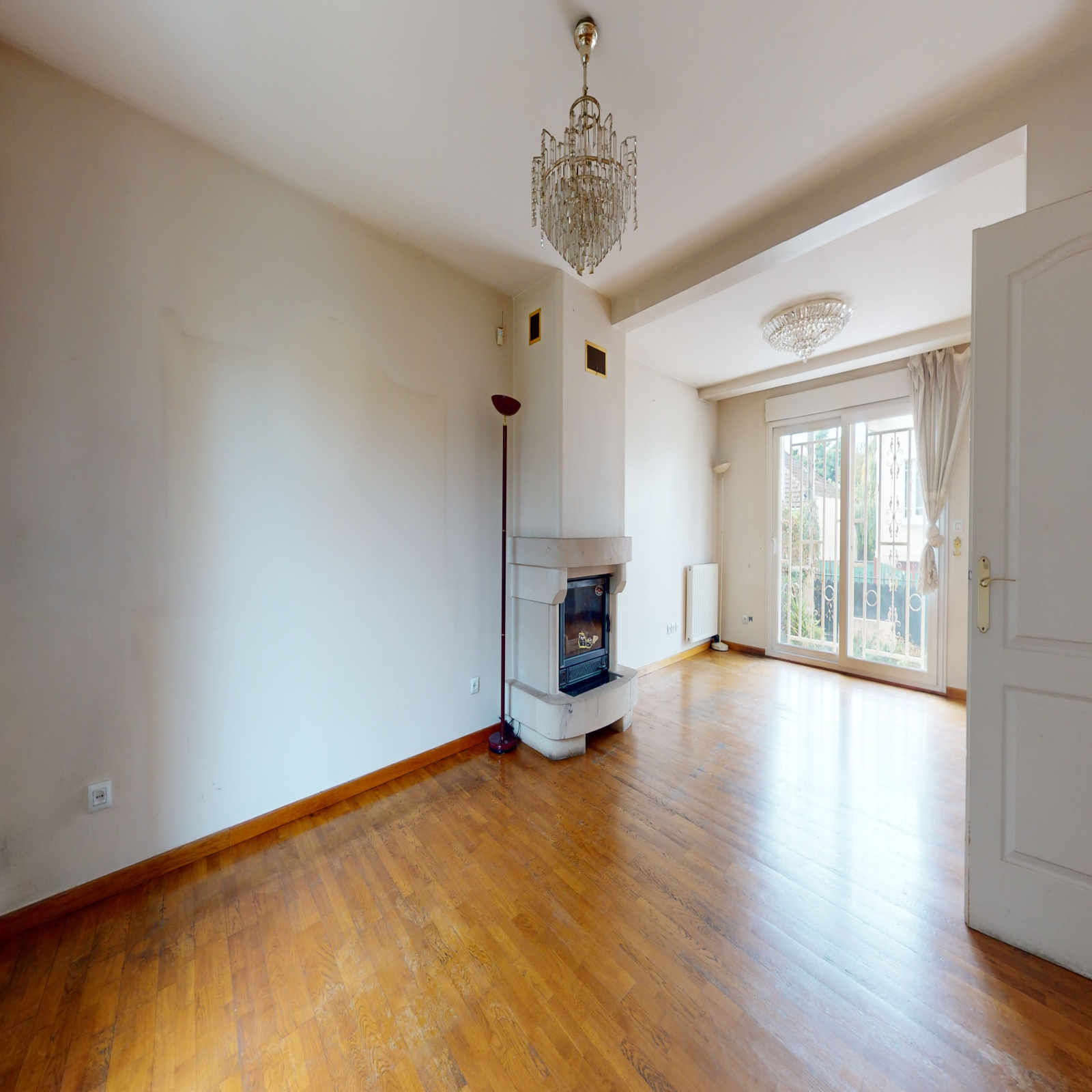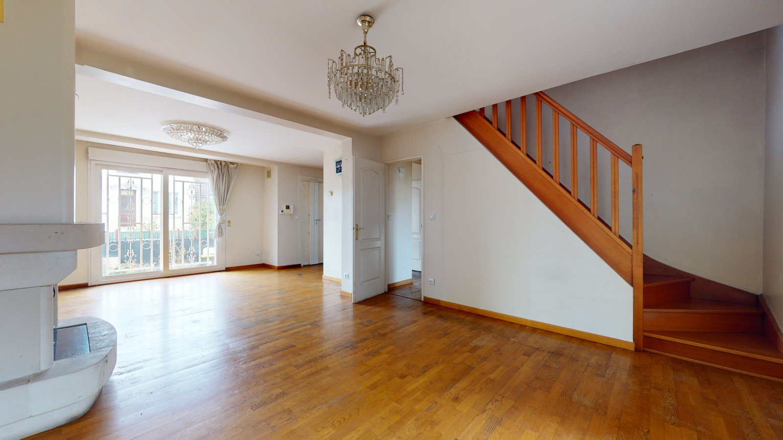 Rdc : Entrée, placard, séjour double de 31 m² avec cheminée et double exposition, bureau, grande cuisine donnant sur jardin, wc.