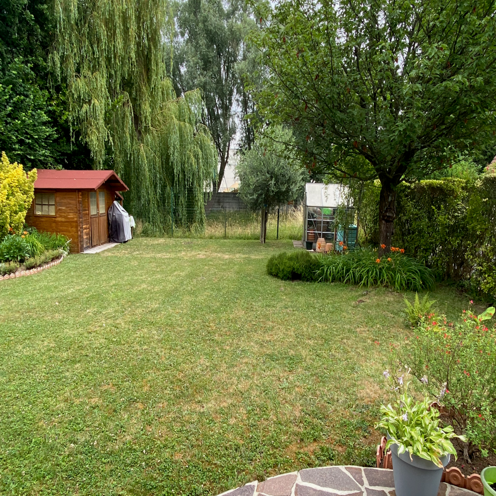 Beau jardin sur l'arrière avec serre et cabanon en bois. Un 2ème accès véhicule sur le terrain.